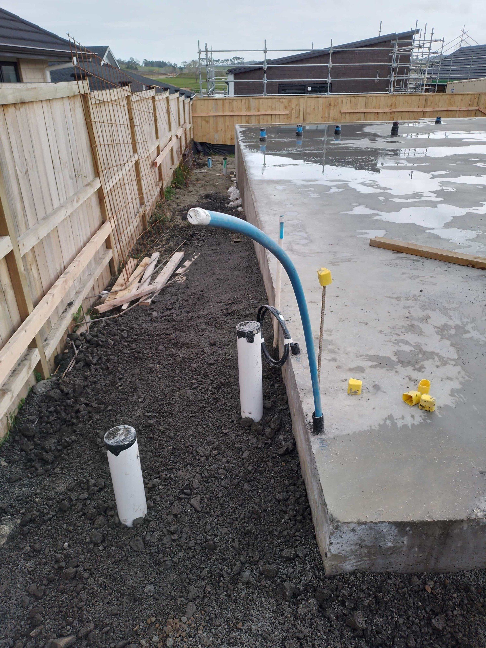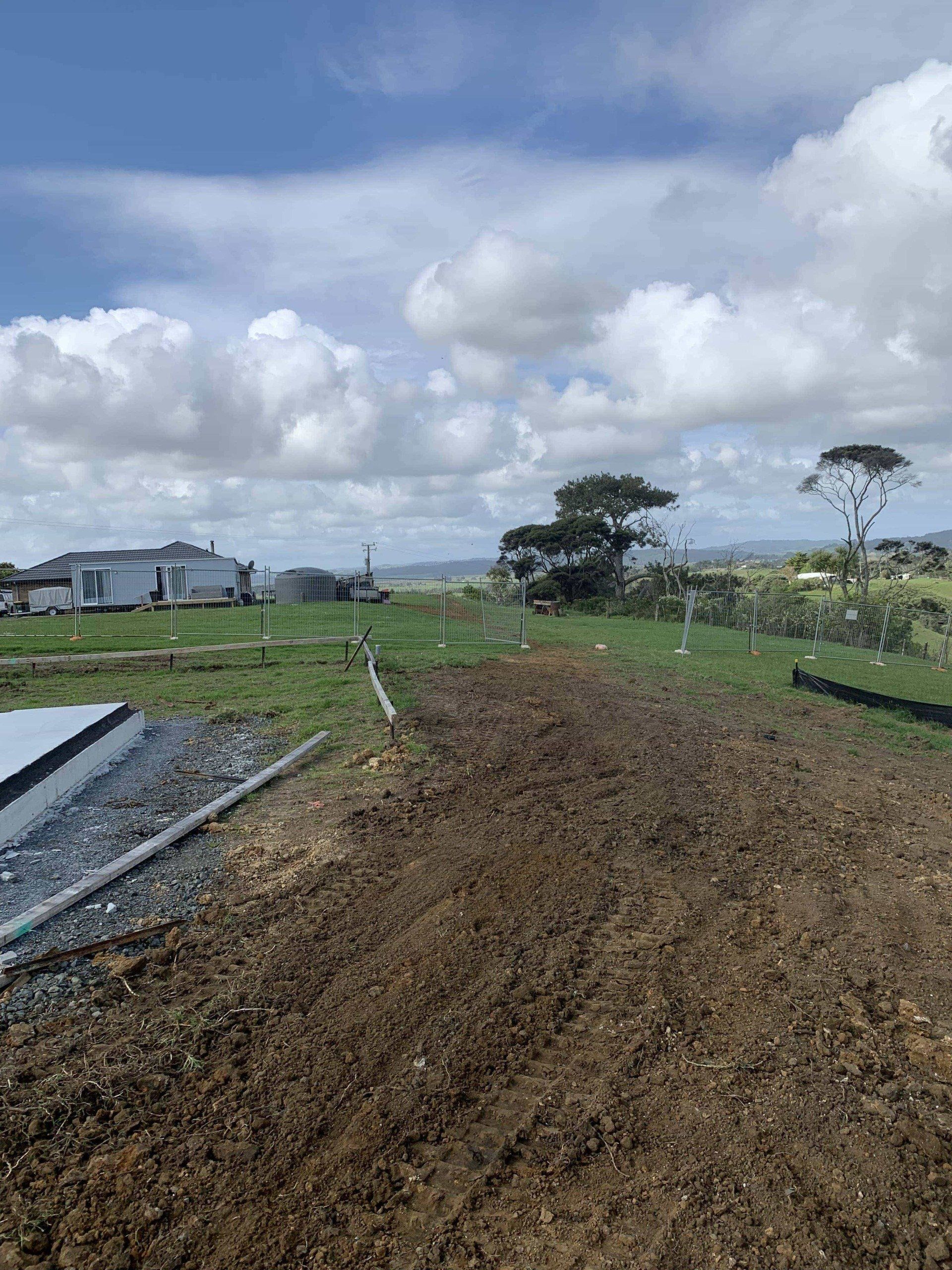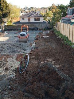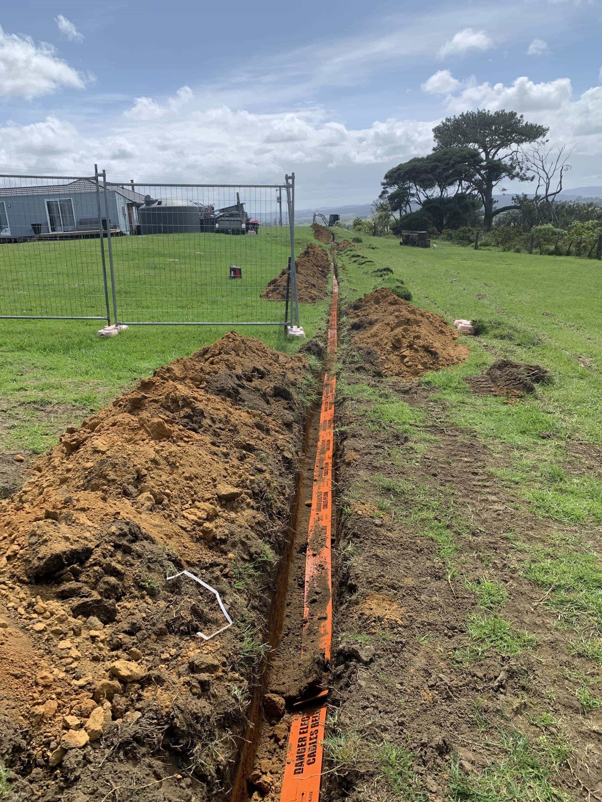 120m trench and lay for new home in Helensville. Aluminium cable trenched at 600mm with mechanical protection at 300mm.